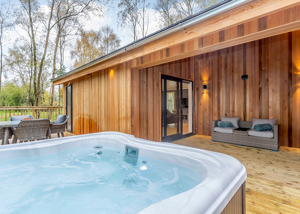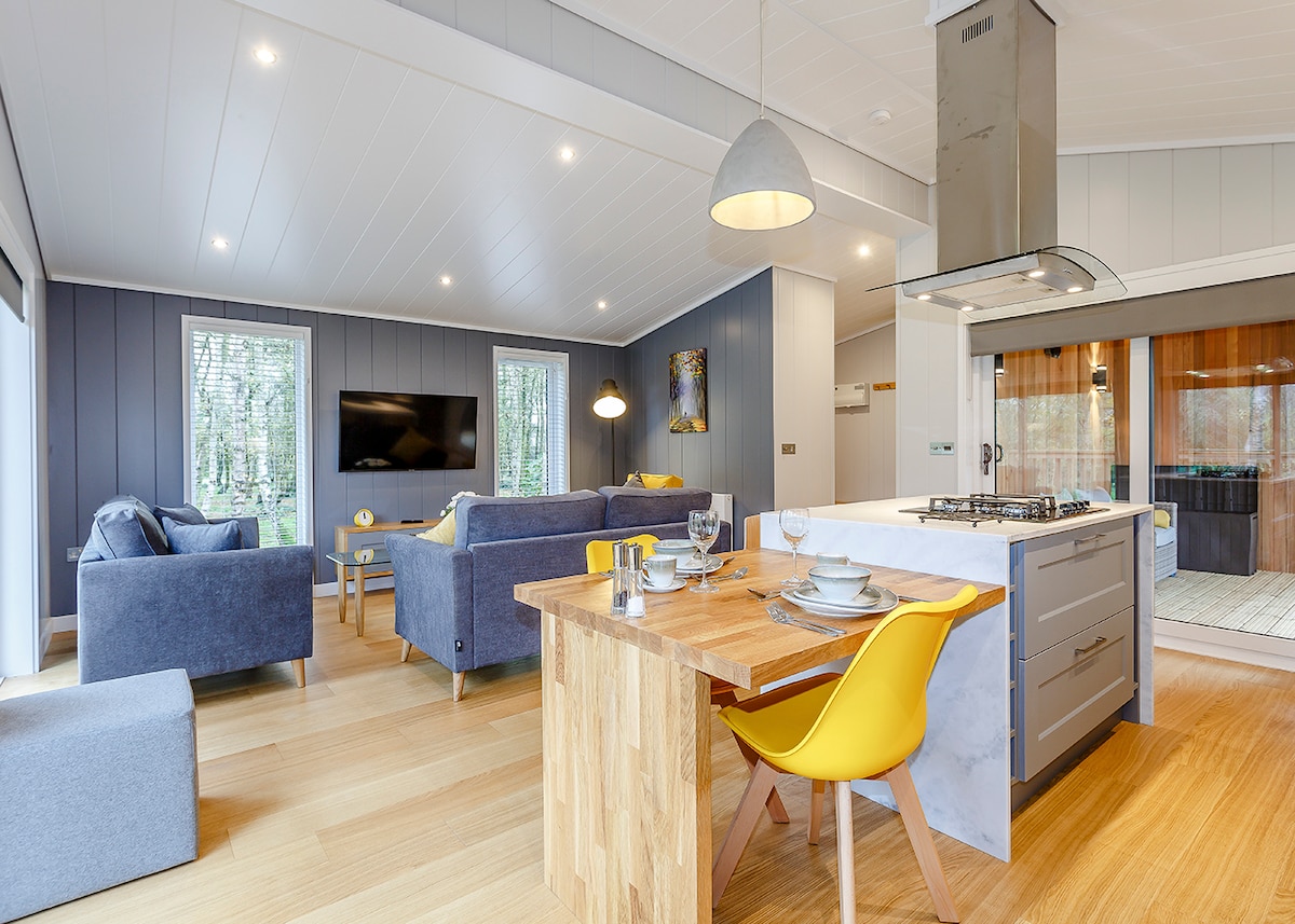 Zrelaksuj się i rozpieszczaj luksusem na najwyższym poziomie w tym stylowym domku z łóżkiem typu king-size, łazienką z wolnostojącą wanną i prysznicem typu walk-in.