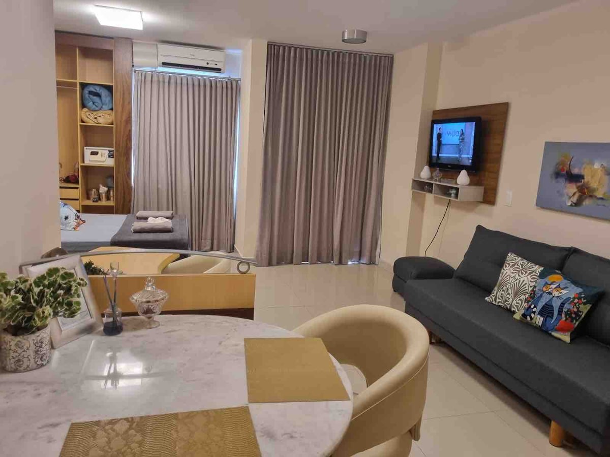Zatrzymaj się w tym pięknym prywatnym lofcie, który oferuje wszystkie udogodnienia niezbędne podczas podróży służbowej lub wypoczynku w Vitória Położony naprzeciwko plaży Camburi, ma łatwy dostęp do lotniska Vitória (3 minuty) Dla większego bezpieczeństwa, masz do dyspozycji całodobową recepcję i dostęp do klubu z basenami dla dzieci i dorosłych, salą gier, barem i przekąskami oraz kilkoma kortami. U W A G A LOFT MOŻE POMIEŚCIĆ 2 OSOBY DOROSŁE W ŁÓŻKU KING SIZE + 2 DZIECI NA ROZKŁADANEJ SOFIE. MAMY DOSTĘPNE ŁÓŻECZKO DZIECIĘCE! =)