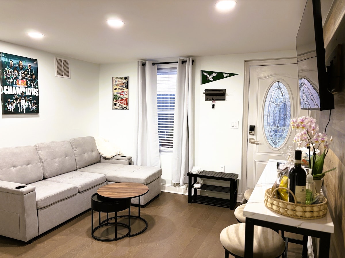 Goście uwielbiają naszą architekturę z przełomu wieków z nowoczesnymi elementami wystroju. Z marmurowym kominkiem, jadalnią i fortepianem, przestronnym salonem z 55-calowym telewizorem z Netflix, Prime, Disney+, Apple, DAZN. Nowa, w pełni wyposażona kuchnia, główna łazienka z toaletą, łazienka rodzinna, prywatne, umeblowane patio z grillem. 5 minut spacerem do Planet Fitness i wioski handlowej -10 do barów i restauracji Fishtown. 2 min samochodem do I-95. 15 min do kompleksu sportowego. 10 min do Old City & Convention Center. Zwierzęta mile widziane za 35 USD za każdy pobyt.