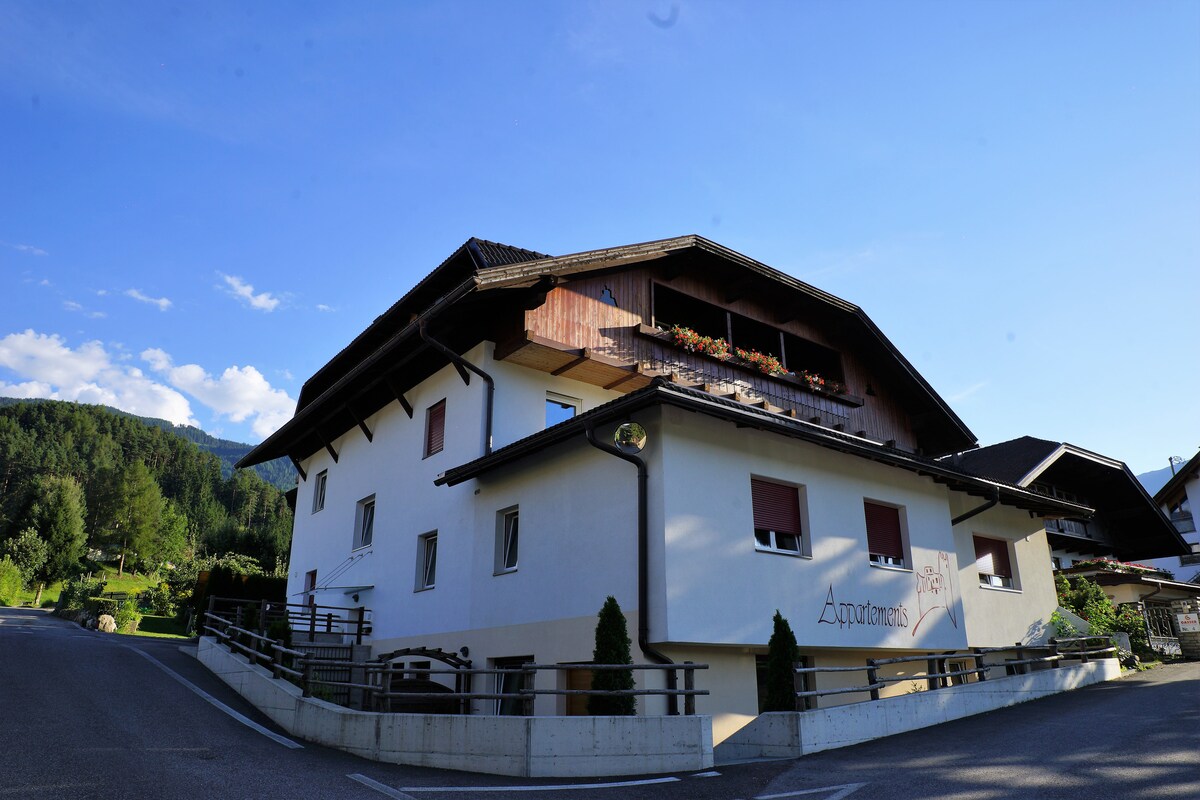 Ferienwohnung für 2 - 4 Personen mit einer schönen nach Osten gelegenerTerasse und angrenzendem Garten. Der Zugbanhof ist zu Fuß in nur 300m erreichbar. Die zentrale Lage der Wohnung ist der perfekte Ausgangspunkt für Ski- und Bergabenteuer in den umliegenden Dolomiten und Skigebieten (Kronplatz, Alta Badia, Gitschberg, Speikboden und Antholz/Biathlon). Das Dorfzentrum mit Geschäften, Bars und Restaurants ist gut zu Fuß erreichbar. Unsere Ferienwohnung liegt direkt am Pustertaler Radweg.