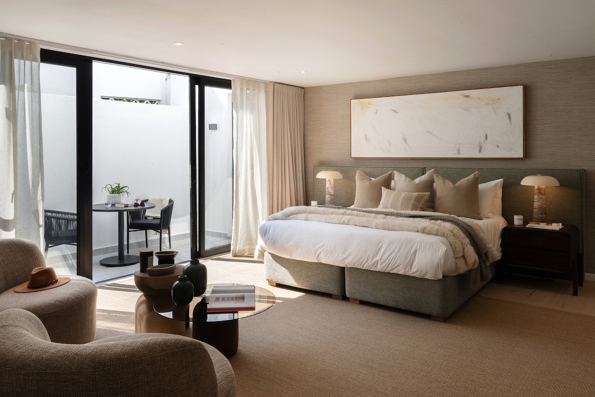 Nasz apartament typu studio otwiera się na 40-metrowy balkon z panoramicznym widokiem na dolinę Hout Bay i góry Helderberg. Duże przesuwne drzwi znikają w ścianach, tworząc niezakłócony przepływ wewnątrz/na zewnątrz, a podwyższona pozycja chroni Twoją prywatność. Łazienka na planie otwartym wychodzi na zamknięty tajemniczy ogród, w którym znajduje się bezramowy szklany prysznic. Lokal posiada w pełni wyposażony aneks kuchenny i jest serwisowany codziennie z wyjątkiem weekendów i świąt.