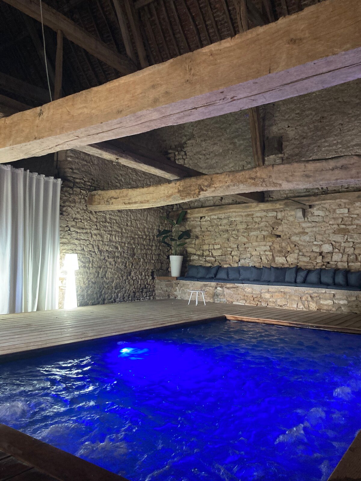 Duży autentyczny dwór, położony między winnicami Beaune a „Côte Chalonnaise”, wystarczająco przestronny, aby powitać rodzinę lub przyjaciół i odkryć wspaniałe wina, gastronomię i urok Burgundii i jego wiosek. Ten stary dom w winnicy z dużym charakterem może pomieścić do 14 osób. Podgrzewany basen z dużymi tarasami, z których roztacza się piękny widok na park. Basen jest wyposażony w osłonę bezpieczeństwa i prysznic na świeżym powietrzu.