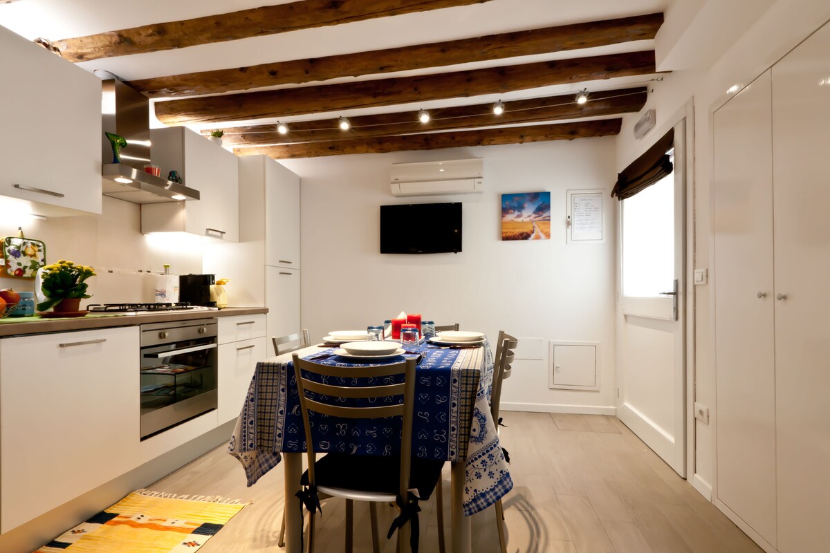 Dom z pięknym widokiem na kanał i kościół, niedawno starannie odrestaurowany z zachowaniem oryginalnych cech, wenecka posadzka, nowoczesne i wygodne meble, zalany światłem i słońcem. W tętniącej życiem dzielnicy w historycznym centrum, kilka minut spacerem od dwóch przystanków vaporetto, w pobliżu Canal Grande, Rialto, muzeów, supermarketów, aptek, typowych tawern. Dostęp za pomocą indywidualnego kodu, ogrzewanie podłogowe, klimatyzacja, Wi-Fi. Dom zdezynfekowany!
