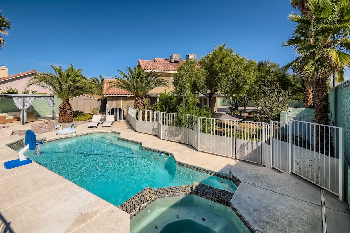 NUMER ZEZWOLENIA NA DZIAŁALNOŚĆ: G64-08206 Nasz przestronny dom 4BR znajduje się zaledwie kilka minut od słynnego na całym świecie Las Vegas Strip; idealny na niesamowity wypoczynek z przyjaciółmi i rodziną! Ogrzewanie spa jest wliczone w cenę bez dodatkowych kosztów! Ogrzewanie basenu kosztuje TYLKO 75 USD za dzień (należy zapłacić za cały pobyt). Ciesz się i zrelaksuj na prywatnym podwórku z basenem i spa! Znajdziesz tu również grilla z propanem, który jest gotowy do rozpalenia! Idealny dom dla maksymalnie 8 osób.