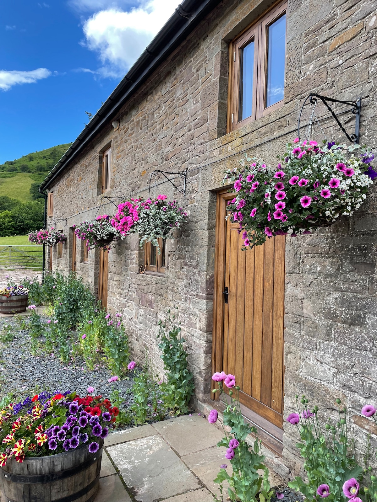Poczuj więź z przyrodą i podziwiaj spektakularne widoki z naszej farmy na wzgórzu w Black Mountains. Historyczna kamienna stodoła została z powodzeniem przekształcona w dwa sąsiadujące ze sobą domki. The Byre, z dwiema dwuosobowymi sypialniami i The Sheep Pen, dwuosobowa sypialnia z podwójną sofą na dole. W pełni niezależne pomieszczenia z aneksem kuchennym, internetem, telewizorami Smart TV, poręcznymi gniazdami USB we wszystkich pokojach oraz pościelą i ręcznikami. Goście mają dostęp do naszych 60 akrów ziemi, na których hodujemy owce i jelenie rzadkich ras.