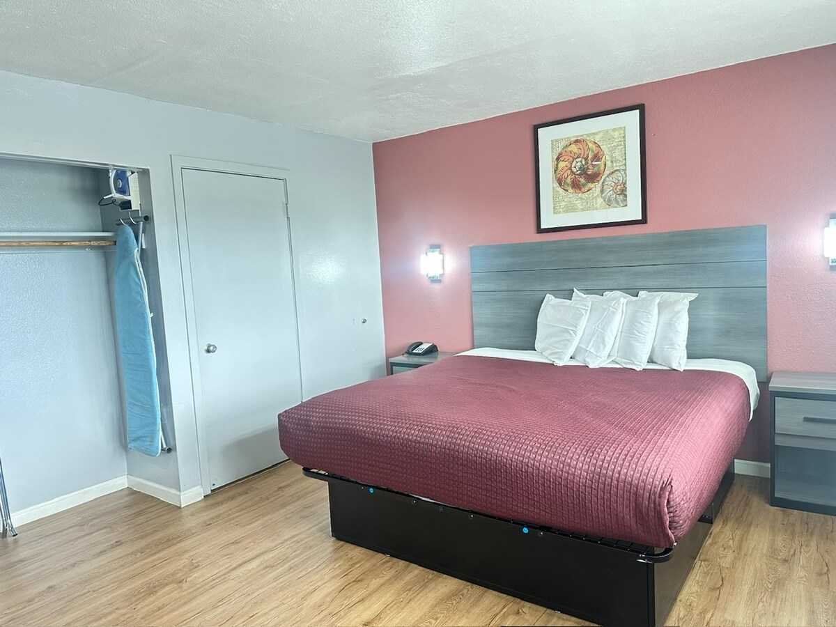 Nasz luksusowy pokój z łóżkiem typu queen jest wyposażony w łóżko typu queen z pluszową pościelą, dzięki czemu jest idealny dla podróżującego służbowo lub dla pary. W tym pokoju znajdziesz kawę/herbatę, telewizję kablową z HBO, bezprzewodowy internet, ogrzewanie, klimatyzację, kuchenkę mikrofalową, lodówkę i inne udogodnienia. Wysypiaj się w jednym z naszych nowych, wysokiej klasy łóżek lub zrelaksuj się i oglądaj telewizję na 50-calowym telewizorze HD Smart TV.