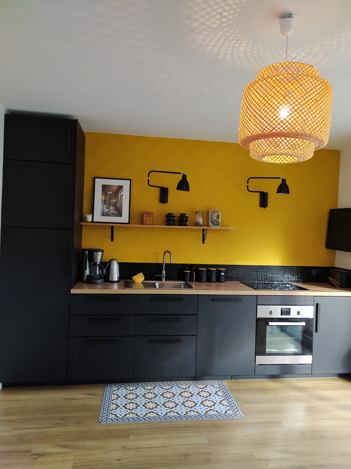 Studio na pierwszym piętrze z balkonem, zawierające: wyposażona kuchnia: płyta indukcyjna, kuchenka mikrofalowa, piekarnik, lodówka z zamrażarką, toster, ekspres do kawy, ekspres Sensèo, czajnik, Telewizor z płaskim ekranem o przekątnej 100 cm Miejsca do spania: rozkładana sofa 140 cm (nowa pościel), łóżka piętrowe na zamówienie (70 x 190 cm). Pościel jest zapewniona, ale nie ręczniki. Mieszkanie jest odpowiednie dla rodziny z dwójką nastolatków. Łazienka: prysznic, umywalka, toaleta. Dostępne podstawowe produkty: sól, pieprz, olej, kawa itp.