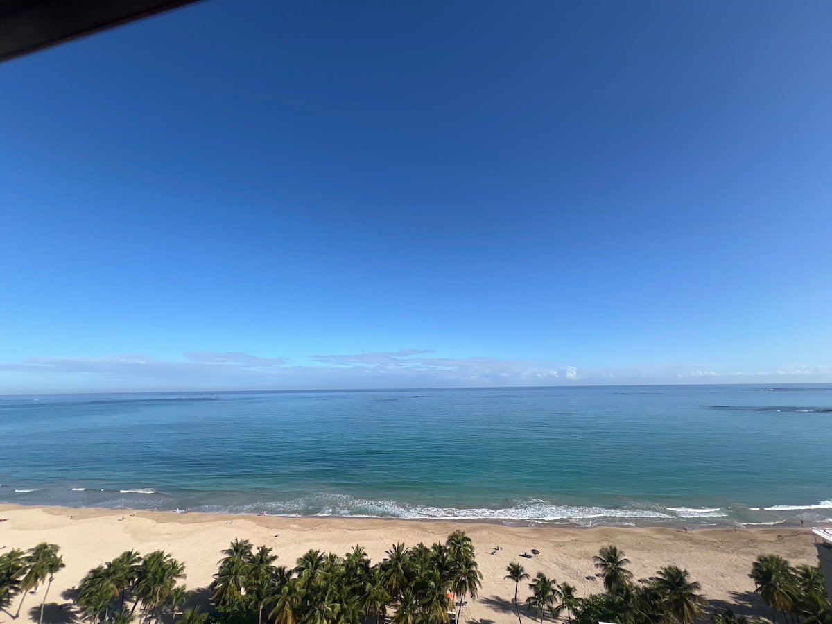 Ocean Front! Balcony. Cement tile floors. Updated kitchen & bathroom. Equipped for a beautiful beach vacation. WiFi, 2 big flat screen TV's. Gorgeous view of the ocean and beach. Private balcony. This condo is on the beach and has pool, sports courts, patios, barbeque & picnic area and outside exercise area. We are located just 10 minutes from the San Juan ( SJU) airport. We share same smooth white sand beach with the famous El Juan Hotel and other 5 Star hotels.