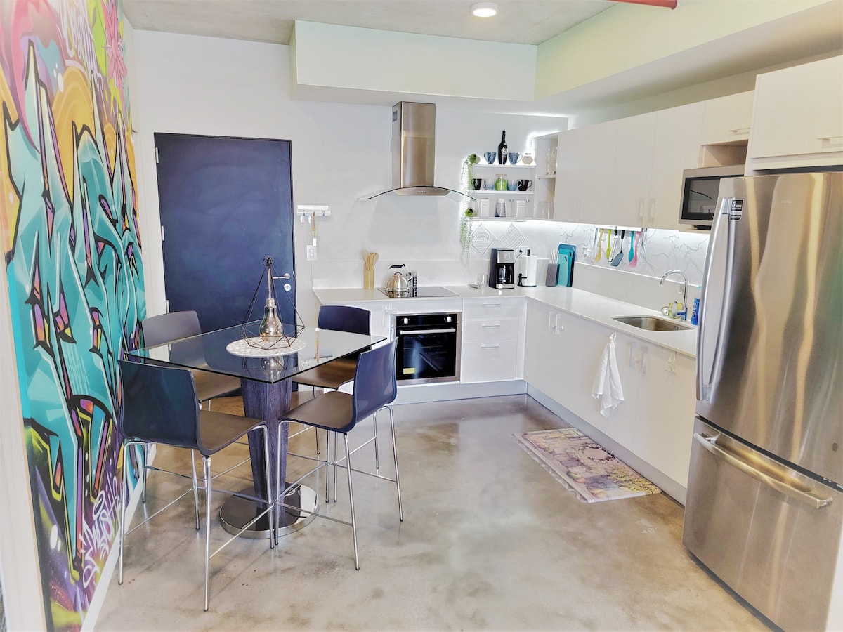 Niezwykle bezpieczny budynek z portierem położony w jednej z 50 najfajniejszych dzielnic na świecie według magazynu Time Out. Najlepsza lokalizacja w mieście!!! Zostaniesz przyjęty przez personel, który umożliwi łatwe zameldowanie za pomocą inteligentnego zamka do mieszkania. Podziwiaj niesamowity zachód słońca w jacuzzi, a następnie przygotuj się na kolację w jednej z 70 restauracji w okolicy. Następnie wróć, aby przespać się w niezwykle wygodnym łóżku typu queen. Obudź się i zrób sobie filiżankę wykwintnej kawy dla smakoszy.