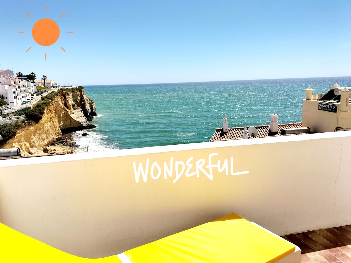 Prepare to be wowed by one of the Algarve’s best cliff locations. Situated just above the glistening waters of the Atlantic Ocean, our spacious studios offer spectacular sea views, with the Algar Seco rock formations on our doorstep! A 10-min. walk away is the centre of Carvoeiro. Features include: free WiFi, LCD Satellite TV, fully furnished kitchen, fire place, air conditioning (cooling/heating) and housekeeping service (incl. kitchen) 5x a week – so you can truly unwind and enjoy your stay!