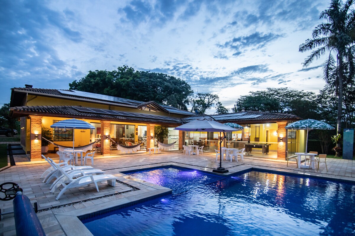 Rancho, przed promem, dla wszystkich rodziny i przyjaciół we wnętrzu Minas Gerais i sercu Serra da Canastra. Dużo miejsca, styl i wygoda. W pełni wyposażone: dwie lodówki, browar, maszyna do lodu, kort tenisowy plażowy, podgrzewany basen, klimatyzacja we wszystkich sypialniach i salonie. Nieruchomość w ogrodzonym kondominium z całodobowym konsjerżem i rundą nocną. Przyjazd na miejsce nie wymaga drogi gruntowej, która jest asfaltowana do drzwi. Mamy molo do łowienia ryb i zacumowania Twojej łodzi.
