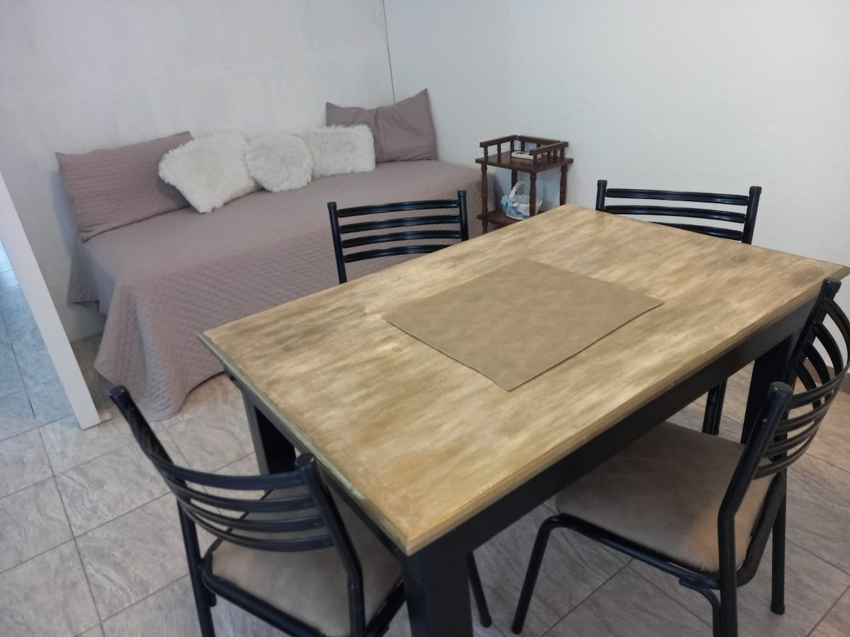 Disfrutá de tu estadía en este departamento independiente con estilo único y todas las comodidades que necesitás. Cuenta con un dormitorio con cama doble ideal para descansar, y un cómodo sillón futón en el living para una tercera persona. La cocina está totalmente equipada para que puedas preparar tus comidas como en casa, y además tiene cochera privada para un auto mediano. Cercano al centro y con rápido acceso desde la ruta 34. Te esperamos!