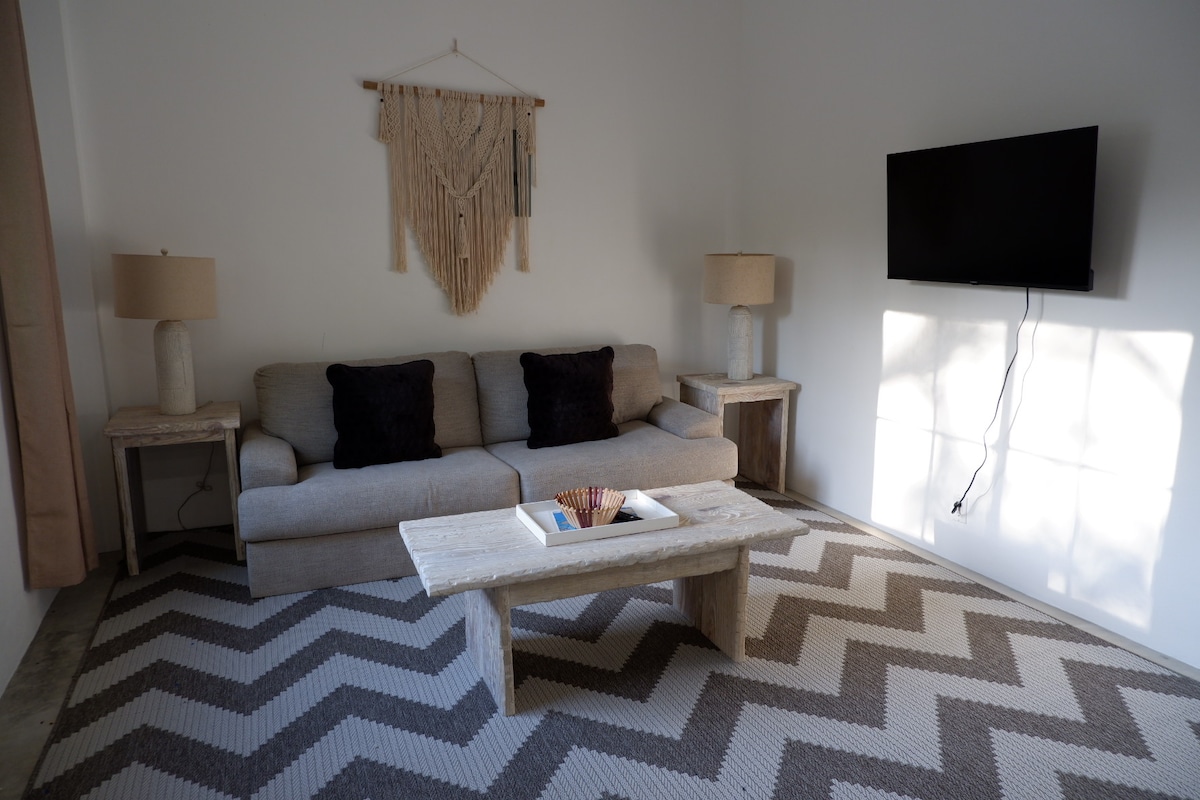 BELIZE IT and enjoy with loding at Popeyes Beach 's przytulne nowoczesne mieszkanie z 1 sypialnią i prywatną łazienką. Rozkoszuj się wylegiwaniem w basenie lub odpocznij, aby obejrzeć film i zrelaksować się w klimatyzacji. W ciągu dnia zarezerwuj zajęcia takie jak nurkowanie z rurką, kitesurfing lub nurkowanie w drugiej co do wielkości Rafie Koralowej na świecie. Wybierz się na spacer i zanurz palce w piasku lub rozkoszuj się słońcem, aby uzyskać idealną opaleniznę, ciesząc się chłodnym morskim Breeze i podziwiając widok na plażę.