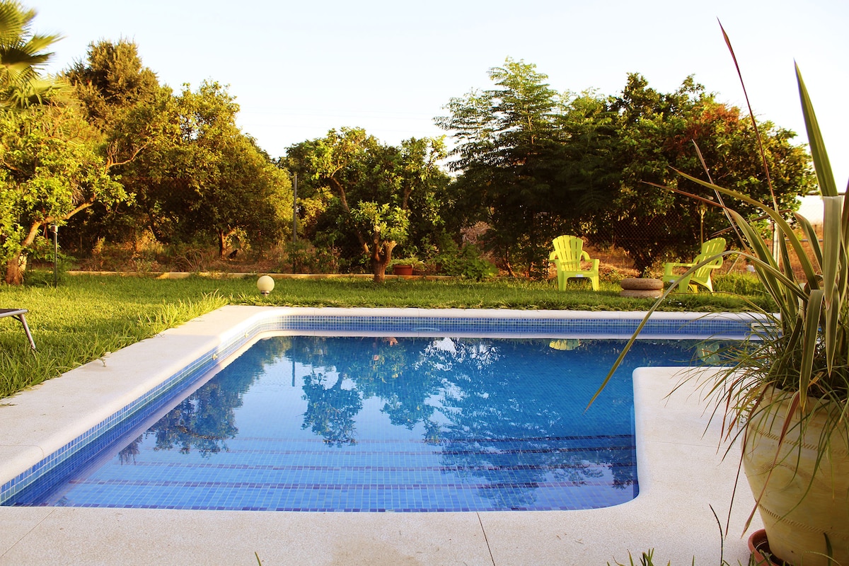 Piękny wiejski dom z dala od miejskiego zgiełku. Wspaniale jest spędzać letnie wieczory na jednej z werand, przy dużym basenie lub w cieniu drzew. Kominek z piecem opalanym drewnem i ogrzewaniem. To dom zaprojektowany z myślą o życiu na łonie natury. Drzewa owocowe i kurnik, które można zjeść . 20 minut od Sewilli autostradą. Oświetlenie zewnętrzne. Prywatność. Zalecany pojazd terenowy, ale nie zawsze. Proszę pytać
