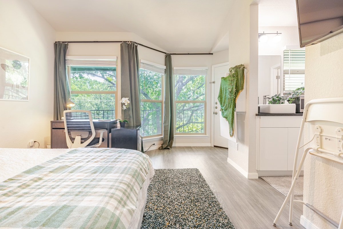 Odpręż się i zrelaksuj w tej spokojnej, stylowej przestrzeni. Dogodny dojazd do centrum i na lotnisko. Duże łóżko z pianką z pamięcią i pościelą hotelową. Prywatny i bezpłatny parking na dobrze oświetlonym podjeździe. Dobrze wyposażony aneks kuchenny z lodówką, ekspresem do kawy Nespresso, kuchenką mikrofalową i naczyniami. Prywatna przestrzeń na świeżym powietrzu. Spacer do Austin Bouldering Project, Austin Eastciders, Bambino's i Springdale General Commons z kawiarnią, restauracjami i wyjątkowymi sklepami. Mniej niż dwie mile do szlaku Lady Bird.