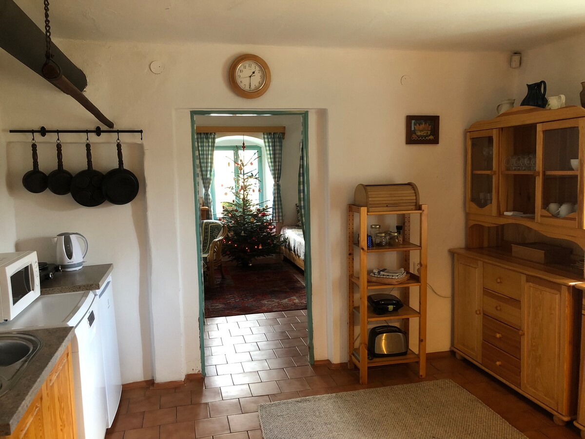 Czarujące drewno wznoszące się jak majestatyczny straż przy bramie do Bohemian Paradise. Wnętrze zmysłowo łączy nowoczesne elementy z odnowionymi drewnianymi meblami, które podkreślają przyjazną atmosferę i domową atmosferę. W pełni wyposażone 2 kuchnie (lodówka, łazienki el.pl, czajnik, naczynia itp.), 2 łazienki i toalety (1 prysznic, 1 łazienka), apartament Valdštejn - 1x pokój czteroosobowy i 1 pokój dwuosobowy oraz apartament Hlavatice - 2x pokój dwuosobowy. Park. spots 3. Wifi yes. Dojazd samochodem do Turnova 5 min.