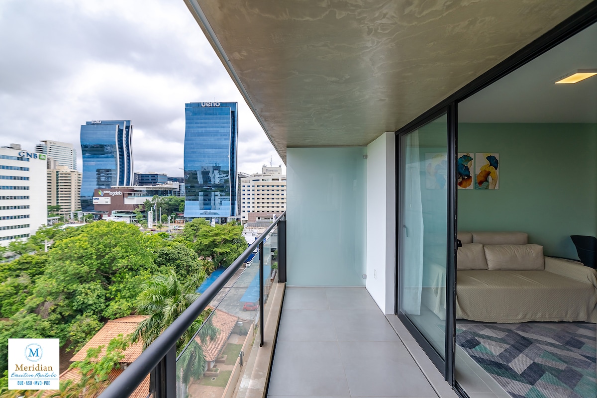 Apartament położony na wysokim piętrze, z balkonem i niezakłóconym widokiem, w pełni wyposażony do komfortowego pobytu: – Duże łóżko z twardym materacem o dużej gęstości – Przestrzeń robocza z biurkiem i Wi-Fi – 55-calowy telewizor Smart TV – Dach z basenem i siłownią - Quincho - Pranie – całodobowa ochrona Wyjątkowa lokalizacja: – Położone w Corporate Axis, zaledwie 5 minut od Shopping del Sol i Paseo La Galería – 15 minut od międzynarodowego lotniska Silvio Pettirossi