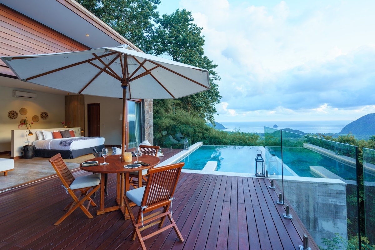 Villa Sarang to połączenie tradycyjnego wzornictwa i nowoczesnej architektury. Te półotwarte domy harmonijnie integrują się z otaczającym je środowiskiem naturalnym i oferują niezakłócony widok 180° na Ocean Indyjski. Każda sypialnia jest niezależna od salonu i dostępna z własnego tropikalnego ogrodu z widokiem na basen bez krawędzi. Willa oferuje pełen zakres usług, w tym prywatnego szefa kuchni w pełnym wymiarze godzin, bezpłatne członkostwo na siłowni, masaże, lekcje jogi, lekcje surfingu itp.