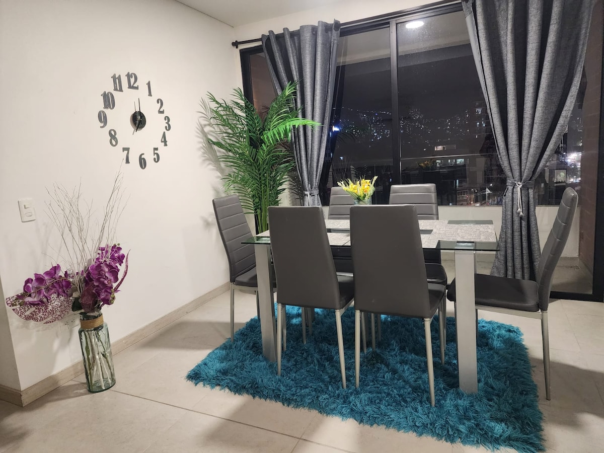 🌟Comfortable, modern and spacious apartment with 2 masters bedrooms and a third room whit two single beds ✨. One complete social bathroom 🚾. Beautiful big balcony with a unique view of the city 🏙️. One HD tv exterior with all national guide, and two additional TVs one in each room. High speed Wifi perfect for communications, meetings, and entertaining the whole family. Close to the subway.🚊Viva Envigado mall across the street 🛍 Common wet areas whit jacuzzi, sauna and gym.