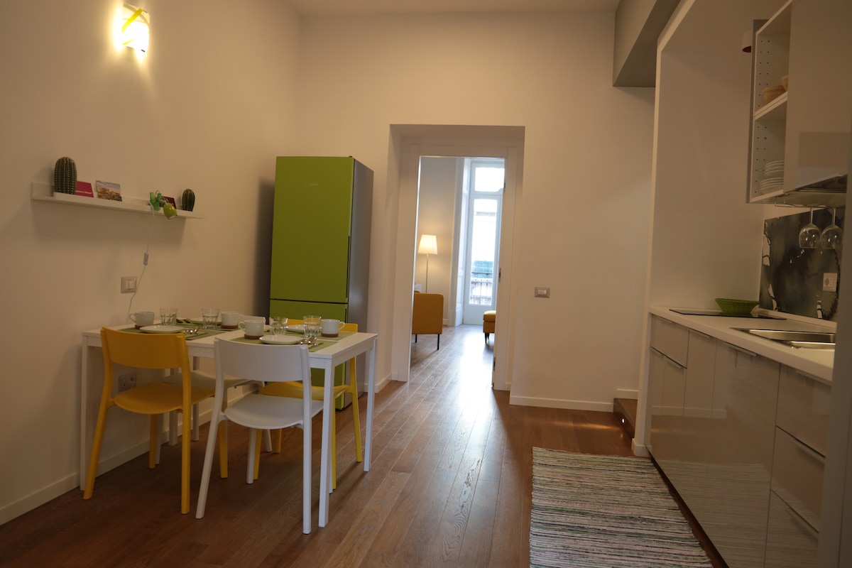 Mieszkanie, całkowicie odnowione i odnowione w meblach w 2020 roku, znajduje się na piątym i ostatnim piętrze, do którego można dotrzeć bez windy. Ta funkcja sprawia, że jest bardzo jasna i panoramiczna z widokiem na miasto i górę Wezuwiusza. Wyjątkową ekskluzywność można znaleźć w miejscu zakwaterowania w zabytkowym centrum. Meble są nowe i nowoczesne, nie zapominając o historycznym pochodzeniu i w przeciwieństwie do starego zrujnowanego budynku z XVII wieku.