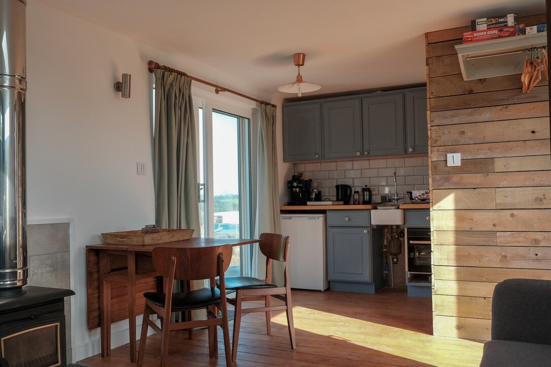 Situated on a quiet road in between the sea side town of New Quay and Llanarth, our cabin is close enough to be by the sea in 5 minutes but without the crowds. The Cabin is situated at the end of our drive, with it's own parking area and a small private garden. Inside, the cabin offers a living space perfect for a couples retreat to get away and unwind.