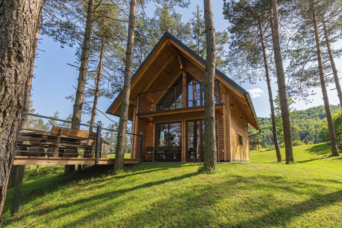 Twój własny domek w lesie, ta niezależna współczesna górska chata, która może pomieścić 6 osób, to idylliczny wiejski ośrodek wypoczynkowy na relaksujące wakacje w sercu przyrody. Goście będą mogli cieszyć się spokojną okolicą, ale także łatwym dostępem do niektórych popularnych miejsc turystycznych w Słowenii. Drzwi wejściowe otwierają się na przestronny, drewniany salon. Stylowe, nowoczesne schody prowadzą do dwóch sypialni, a na wprost znajduje się otwarta część wypoczynkowa/jadalnia.
