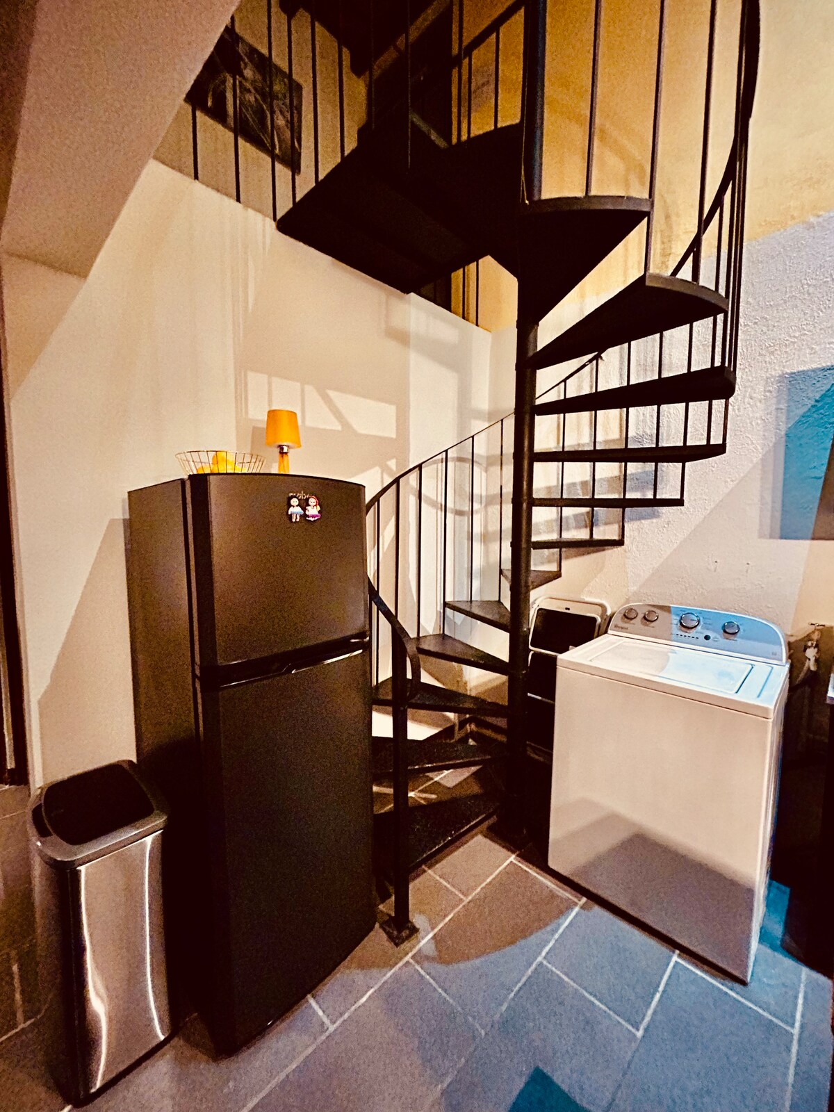 Ten apartament znajduje się w centrum Antigua, zaledwie 50 metrów od pięknego kościoła La Merced i w odległości dwóch minut spaceru od słynnego żółtego łuku Antigua. Sypialnia, łazienka i część mieszkalna na piętrze są połączone z aneksem kuchennym na dole za pomocą spiralnych schodów. Goście mają dostęp do własnej części tarasu. To mieszkanie jest idealne dla pary lub osoby podróżującej w pojedynkę. *Pamiętaj, że spiralne schody mogą być trudne dla małych dzieci lub osób starszych*