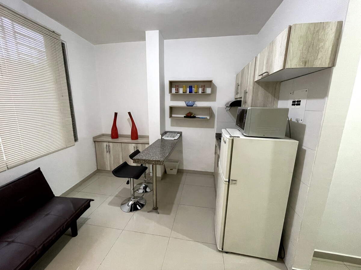 Perú Boutique: Modern Apto in Exclusive North Cali. Is strategically in Santa Mónica neighborhood. This quiet, comfortable, well-equipped, and illuminated space is just minutes away from the vibrant -Zona Rosa- of Granada. It is the ideal place for business trips or tourism, as it features excellent Wi-Fi connectivity. Unbeatable Location: Within walking distance, you will find gyms, a wide variety of restaurants, easy access to public transport, supermarkets, and shopping centers.