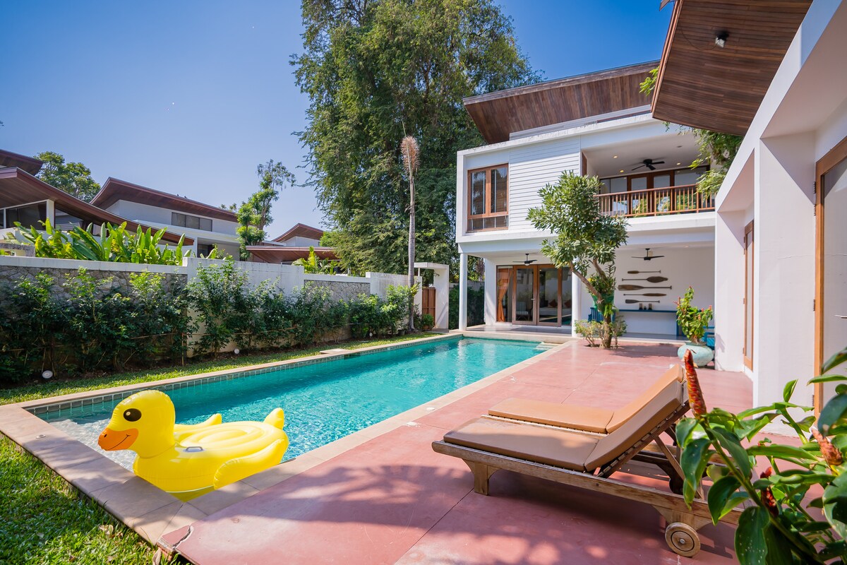 Prywatna willa z basenem – The Sand and I Private Pool Villa, Zrelaksuj się w prywatnej willi z 4 sypialniami, 5 łazienkami i basenem w samym sercu Hua Hin, kilka kroków od plaży. Ciesz się jasnym salonem z dużym telewizorem i streamingiem na Disney+ i Netflix – idealnym na przytulne wieczory filmowe po dniu na plaży lub grze w golfa. Cała willa i prywatny basen – Twoja grupa ma pełny i wyłączny dostęp do nich podczas pobytu.