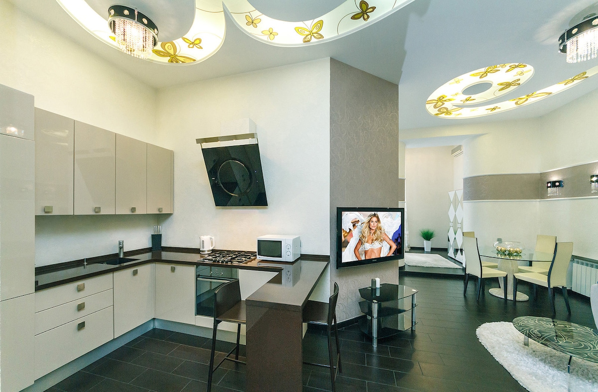Nowy, stylowy apartament w pobliżu Golden Gate w samym sercu historycznego centrum Kijowa: 2 minuty od Golden Gate, 3 minuty do Sophia i Placu Michajłowskiego, 5 minut do Chreszczatyku, 7 minut do Placu Niepodległości i wszystko w odległości spaceru. Mieszkanie jest po remoncie projektanta. Dla wygody gości oferujemy studio kuchenne z przestronnym salonem i wygodną rozkładaną podwójną sofą. Przytulna sypialnia z wygodnym dużym łóżkiem i własnym telewizorem.