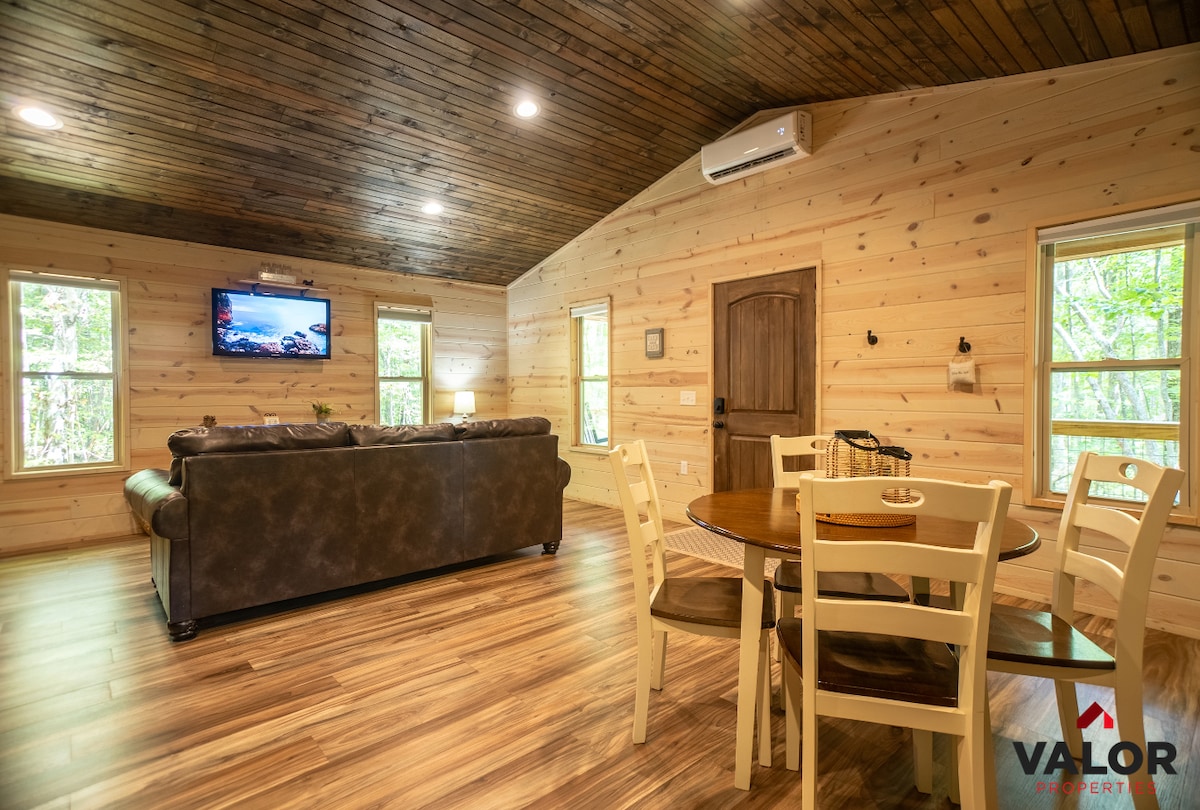 Finding Grace is a one-of-a-kind cabin that feels like stepping into a storybook. Set at the edge of wide-open meadows with sweeping views, it offers a sense of calm and space that’s hard to find anywhere else. Inside, you’ll find warm wood walls, rustic beams, and cozy furnishings that invite you to slow down and unwind. The loft bedroom holds a full bed tucked beneath the A-frame roofline, while the main level offers a futon-style sleeper and plenty of natural light.
