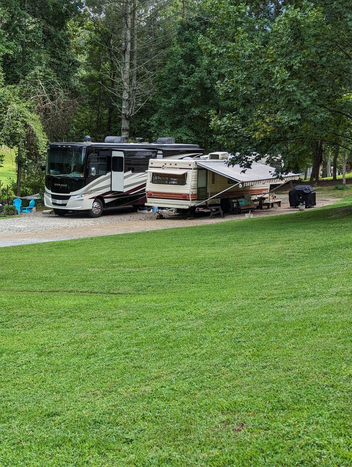 Get away from it all when you stay at our private retreat overlooking a 40 acre mountain meadow. You will have all the amenities of home in this 35 foot luxury camper/RV. Camper has full water, power and septic hookup. Our peaceful getaway is 1.5 miles from Margarita Jack’s marina on Lake Chatuge, 3 miles from Jack Rabbit Mountain biking and trails and 8 miles from both Hiawassee, GA. and Hayesville, NC. Come and enjoy the peace and quiet of the mountains and adventure of the lake.