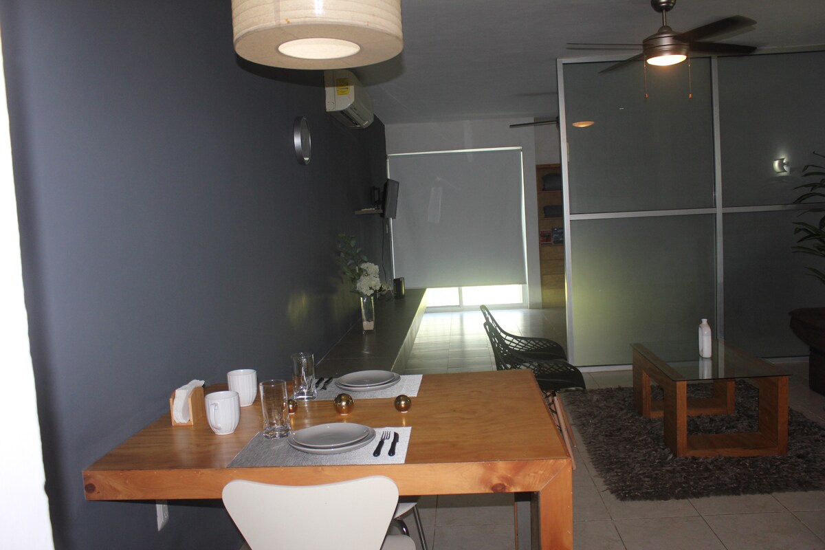 Apartament z dobrą lokalizacją, 5 minut od lotniska i pociągu Maya, a także terminala ADO... na głównej alei, idealny na krótkie pobyty lub wizyty służbowe. A/C. Wi-Fi. Smart T.V * Łatwy dostęp do taksówek * Czysto i schludnie * Bezpieczne miejsce do przechowywania pojazdu (parking poza obiektem) * W odległości 100 metrów znajdziesz: restauracje, pralnie, apteki, szpitale * Centralna i bezpieczna przestrzeń