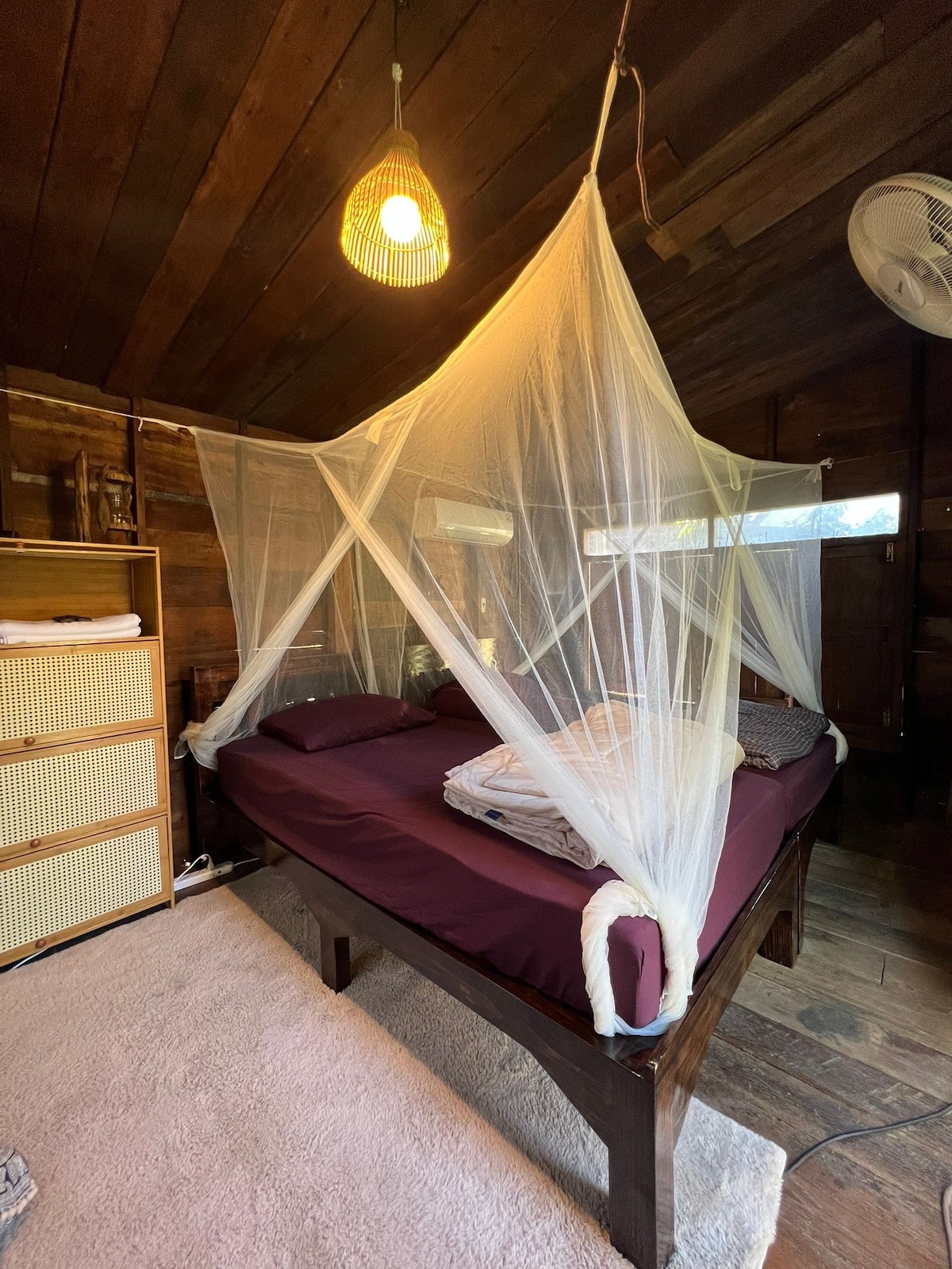Nestled in the small village of Mea Na, in the green hills of Chiang Dao, the Baan Len room offers a warm atmosphere thanks to its natural wood design. This charming room consists of a comfortable main area, with a mezzanine equipped with a bed that can accommodate two children. On the ground floor is a patio, perfect for enjoying the fresh mountain air in the evening. Free parking right next to the bedroom entrance.