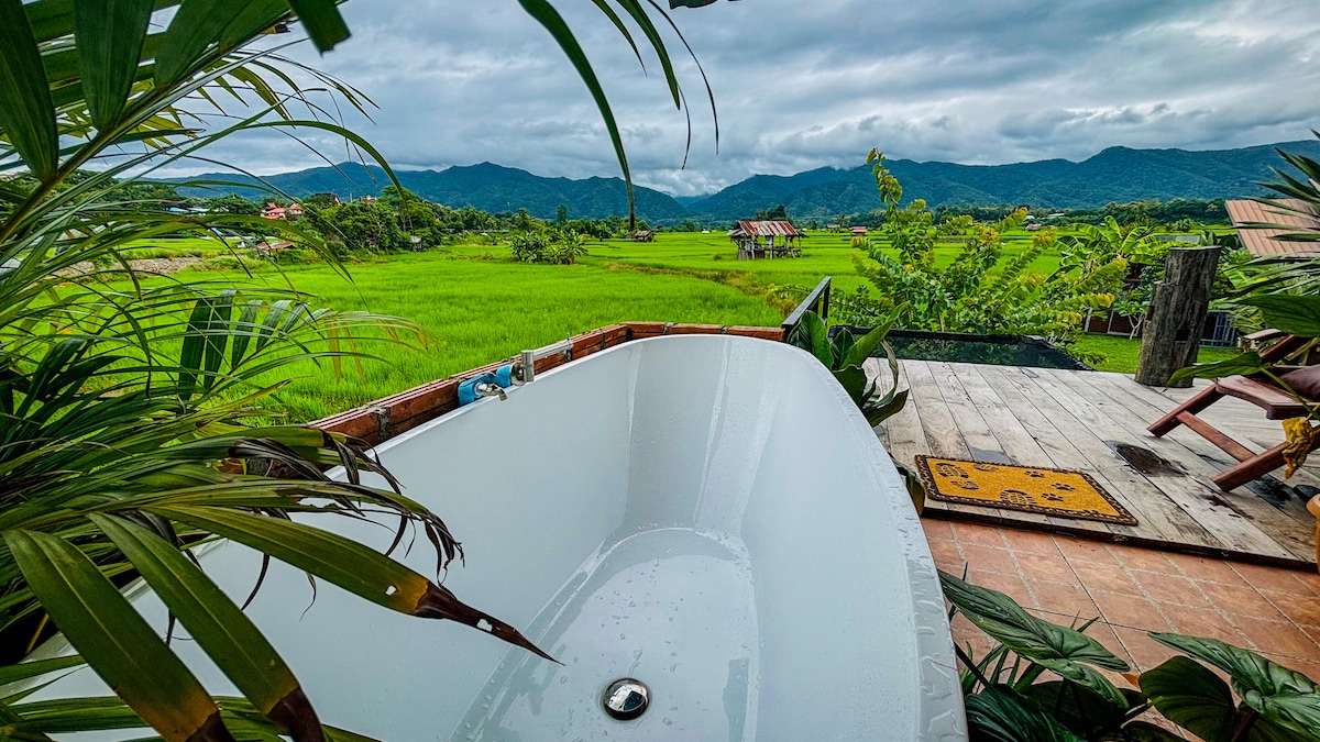 บ้านธาราถูกออกให้มีสไตล์เรียบง่าย มีชานระเบียงในร่ม ห้องน้ำเห็นวิวทุ่งนาด้านข้าง อ่างฟองโฟมวิวขา ลานนั่งเล่นระเบียงกลางแจ้งชิดทุ่งนา มาพร้อมเตียงเดี่ยว 3.5ฟุต 2 เตียง นอนสบายเติมพลังกายและใจในที่พักเงียบสงบและมีสไตล์ ล้อมรอบด้วยทุ่งนา ภูเขา และลำธาร