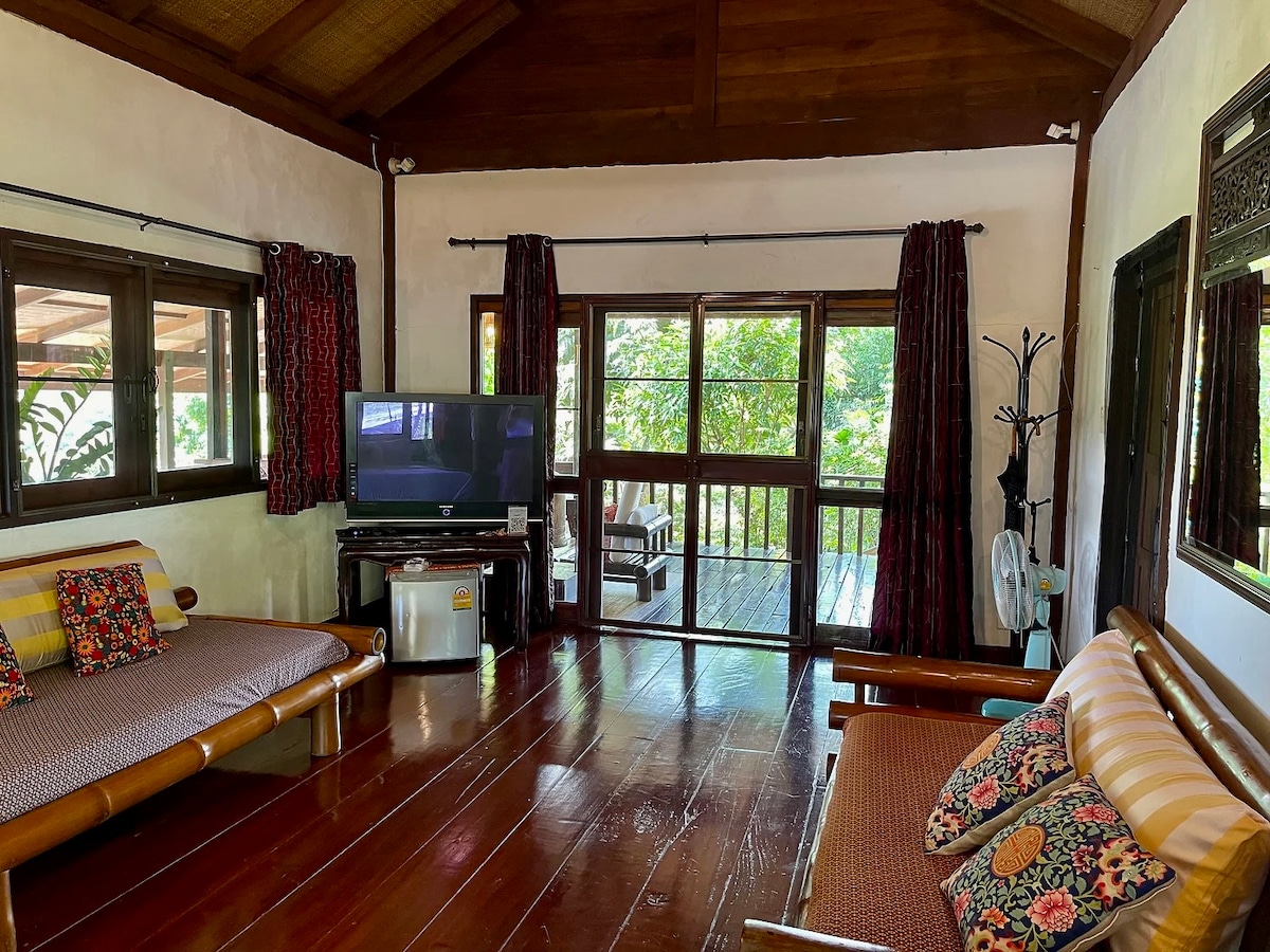 Ten przestronny, komfortowy i elegancko urządzony pokój jest jednym z 2 w nowoczesnym, wolnostojącym budynku w stylu tropikalnym. Od mojej willi dzieli go staw o długości 15 metrów. Możesz również korzystać z dużego, tropikalnego ogrodu leśnego (współdzielonego) z zadaszonymi tarasami. W dolnej części ogrodu znajdują się moje 2 tradycyjne drewniane tajskie domy na palach oraz recepcja / jadalnia.