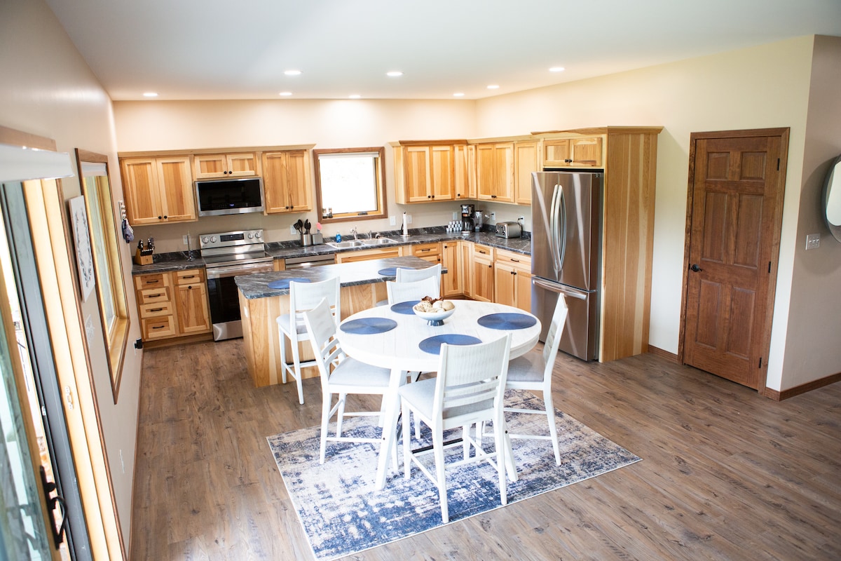 The Ice House is a hygge-inspired vacation home with amenities of an upscale rental. Our home is newly renovated with 100 ft of private frontage on beautiful Ice Lake. Imagine your morning cup of coffee on the master bedroom deck with panoramic views of the lake. Upscale amenities include granite countertops, 4 smart TV’s, and spa-like finishes in 3 bathrooms. The Ice House is centrally located in Iron River close to Ski Brule and other outdoor activities enjoyed in scenic Iron County.