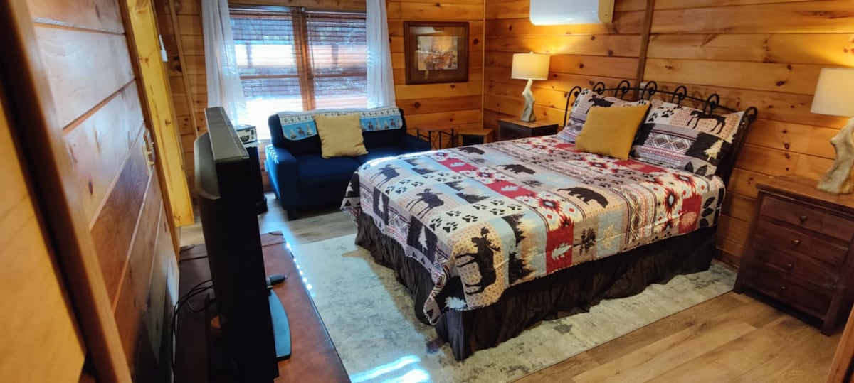 Piękny i spokojny wypoczynek czeka na Ciebie w naszym przytulnym apartamencie! Znajdziesz swoje szczęśliwe miejsce w naszym pięknym studio z wygodnym łóżkiem typu king, podgrzewaną podłogą w łazience, deszczownicą i wieloma innymi udogodnieniami. Wypij poranną kawę na werandzie, słuchaj śpiewu ptaków i ciesz się spokojem okolicy. Skontaktuj się z nami przed dokonaniem rezerwacji, jeśli Twój zwierzak waży ponad 100 funtów!