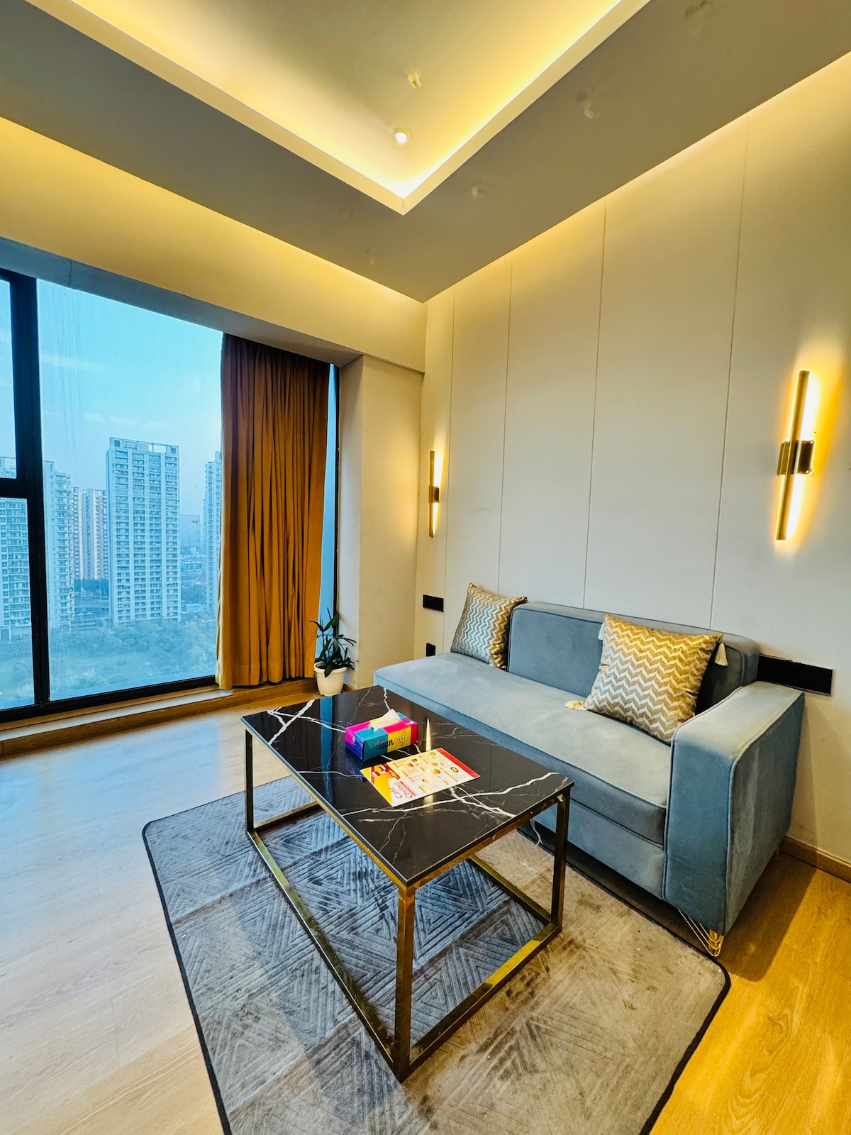 ✨ Luksusowe studio z widokiem na panoramę | Wysokie piętro | Balkon | Prime Noida Obudź się nad miastem w tym eleganckim apartamencie na wysokim piętrze, starannie zaprojektowanym dla gości, którzy cenią sobie komfort, prywatność i pobyt na najwyższym poziomie. Ta przestrzeń, położona w jednej z najbardziej pożądanych wież Noidy, oferuje piękne widoki, prywatny balkon i wnętrza o jakości hotelowej – idealne dla osób podróżujących służbowo, par oraz na długie lub krótkie pobyty.