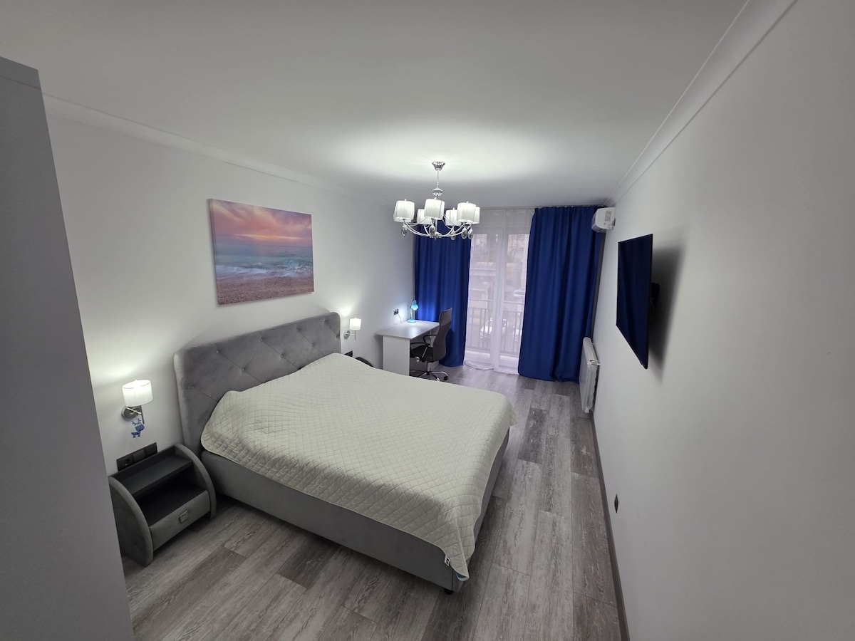 Welcome to GrandStay Apartments, the pinnacle of luxury in Chișinău’s ultracentral heart. This high-end apartment offers floor-to-ceiling glass walls with panoramic views of Cathedral Park, three private balconies, and designer furnishings. Enjoy a premium king-size bed, a stunning in-bedroom bathtub overlooking the park, and a stylish bathroom. A private gym with a city-view terrace and a dedicated concierge complete this exclusive experience.