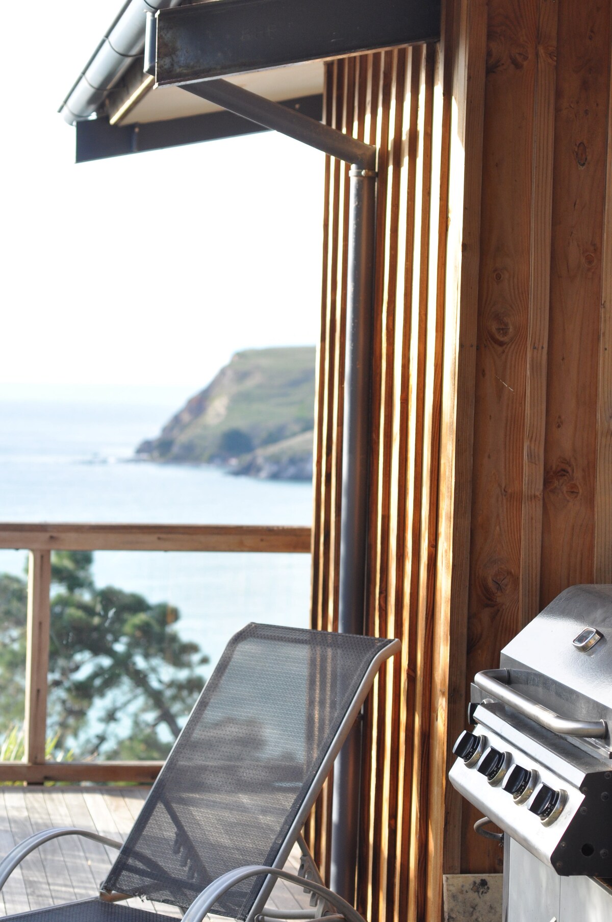 Odpręż się i zrelaksuj w tej spokojnej, stylowej przestrzeni na końcu prywatnej alejki. Dostęp do domu prowadzą zewnętrzne schody. Dom jest podzielony na dwie części połączone zewnętrznym tarasem. Wysokie sufity i drewniane ściany tworzą ciepłe wnętrze przypominające domek letniskowy, z dużymi wentylatorami sufitowymi w każdym pokoju i kominkiem na drewno. Szklane drzwi przesuwne otwierają się na dramatyczne widoki na port i wzgórza. Wypij drinka, zrób grilla na dużym tarasie lub zrelaksuj się w gorącej wannie na świeżym powietrzu. Zaledwie 5 minut spacerem od lokalnego supermarketu i browaru.