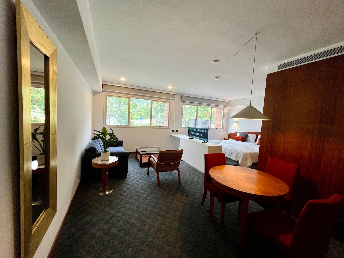 Komfortowy apartament o powierzchni 60 m2 położony w obrębie CCCT. Bardzo dobrze wyposażone, z widokiem na Avila i doskonały internet, nowe łóżko. Dostęp do kortów tenisowych i basenu. Jeśli nie widzisz dostępności w terminie, którego szukasz, zapytaj! Mamy inne apartamenty w tym samym budynku. Bezpieczne, prywatne i niezawodne. Uwzględniamy parking po 2 dniach pobytu. Sklepy, martwe życie, apteki, kliniki i restauracje dostępne tylko po zjechaniu windą.