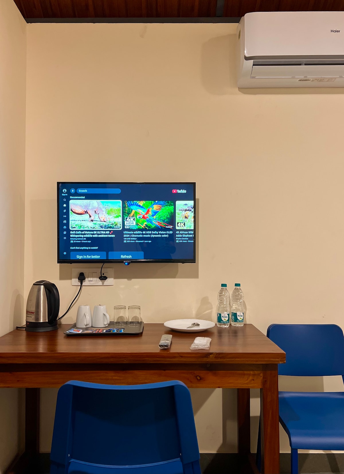 Ta przytulna drewniana chatka położona w bujnej zieleni Wayanad oferuje łóżko typu king-size, wygodną sofę i prywatny balkon ze wspaniałymi widokami. Łazienka z oświetleniem LED oferuje prysznic z deszczownicą i gorącą wodą, które zapewniają relaksujący pobyt. Zrelaksuj się w basenie bez krawędzi, otoczony mglistymi górami, lub wypij herbatę na ręcznie wykonanym balkonie. Idealne dla par i miłośników przyrody – to idealne połączenie rustykalnego uroku i nowoczesnego komfortu.
