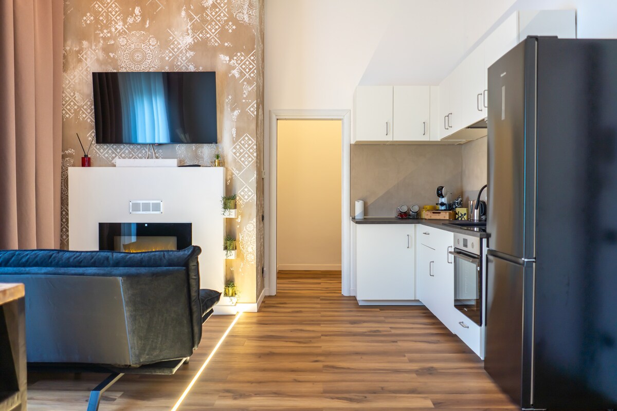 Pobyt w oazie elegancji i spokoju z widokiem na piękne wody jeziora. Ten wspaniały apartament oferuje niezapomniane wrażenia z pobytu, łącząc urok historycznej scenerii z najbardziej wyrafinowanymi nowoczesnymi udogodnieniami. Apartament znajduje się w zabytkowym budynku, który został starannie odnowiony, zachowując swój oryginalny charakter z elementami współczesnego designu. Duży salon posiada duże okna, które zapewniają zapierający dech w piersiach widok na jezioro.