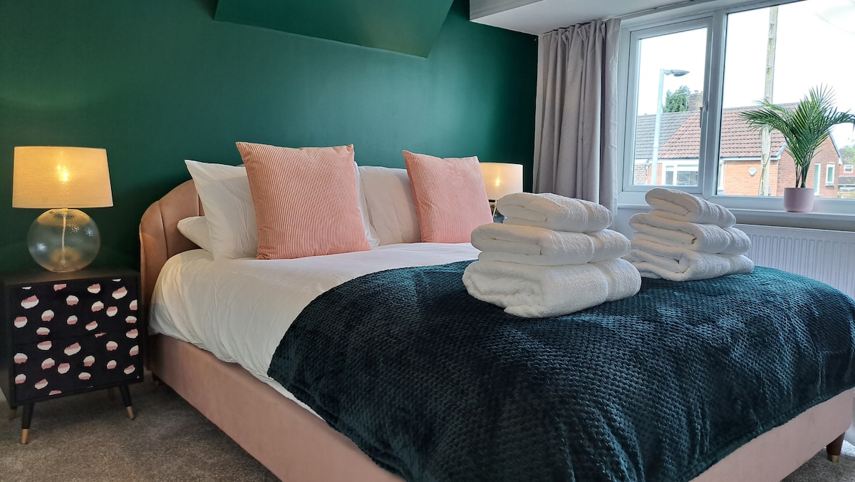 Witamy w naszym uroczym domu z 3 sypialniami położonym w spokojnej dzielnicy Barton w Eccles w Manchesterze. Niezależnie od tego, czy odwiedzasz Manchester w interesach, czy dla przyjemności, nasze apartamenty z obsługą oferują wszystko, czego potrzebujesz, aby Twój pobyt był niezapomniany. Dzięki bezkonkurencyjnemu połączeniu komfortu, wygody i uroku czekamy na Ciebie w naszym domu z dala od domu. Główna sypialnia ma łóżko typu king size, druga sypialnia ma podwójne łóżko, a trzecia sypialnia ma pojedyncze łóżko.