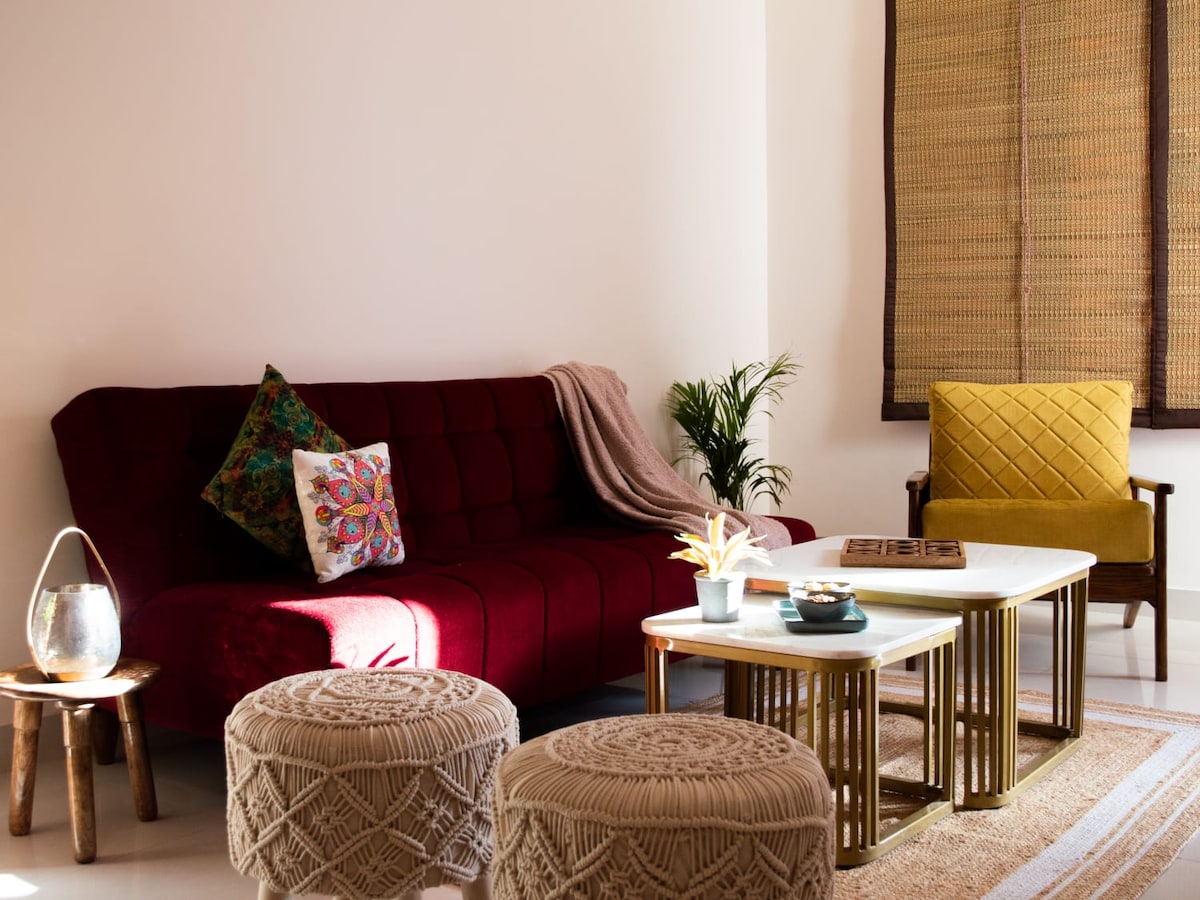 Ideal home for a FAMILY - Luxurious 2-bed, 2-bath apartment in Udaipur’s busy location ideal for families, travel enthusiasts or working professionals. Sleeps 5 with 2 double beds + 1 divan-style sofa bed. Modern décor, 70”smart TV, L-shaped sofa, AC in every room, two balconies, fully equipped kitchen, and workspace. Walking distance to cafes, restaurants, shops, temples, schools. Housekeeping and daily cleaning ( available on prior request) included in the price.