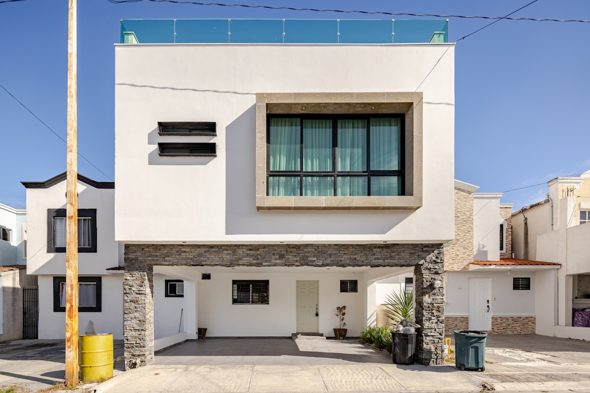 Facturamos. Ucieknij do ciepłego, nowoczesnego, świeżo odnowionego domu w stylu butikowym. 19 minut od lotniska i 35 minut od centrum Monterrey, prywatne z całodobowym nadzorem, blisko parków przemysłowych i sklepów. Korzystaj z butikowych łazienek, klimatyzowanych sypialni z ogrzewaniem, 75-calowych mini ekranów LED z dźwiękiem Bang & Olufsen w pokoju i sypialni. Aplikacje do streamingu, Xbox, gry planszowe i taras z telewizorem, grillem i meblami ogrodowymi. Meble z kamieniem Saint Laurent. Wszystko, co sprawi, że pobyt będzie niezapomniany