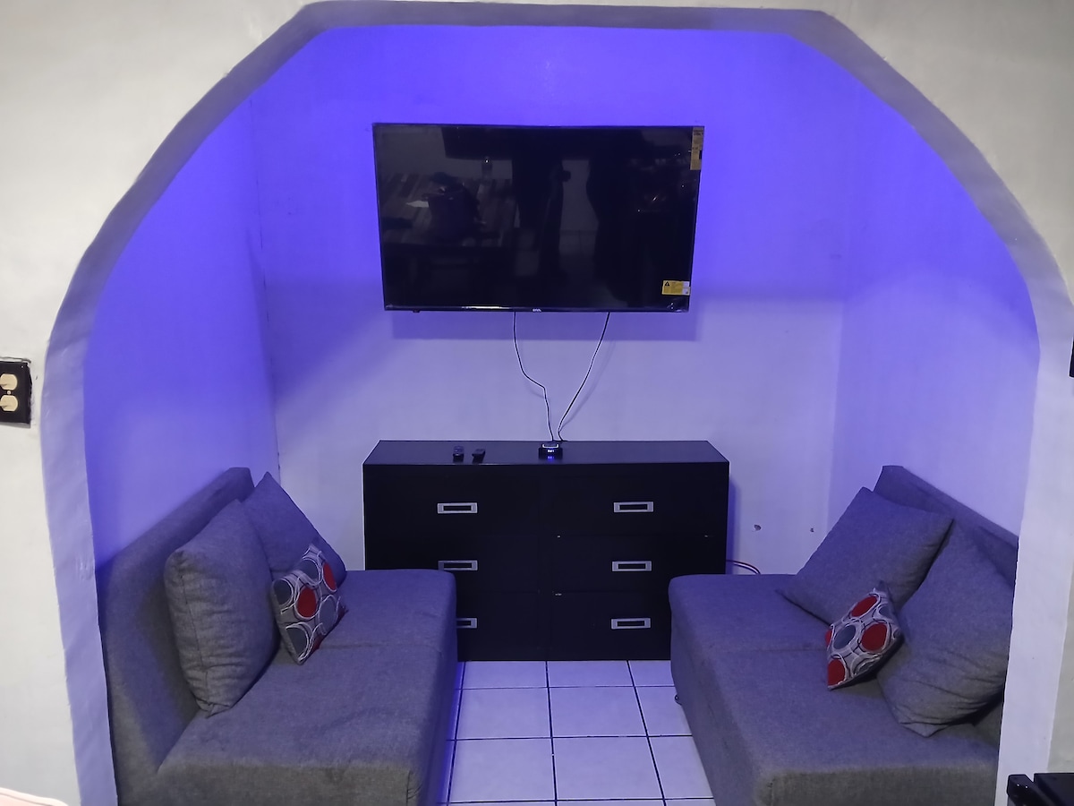 Przestrzeń 5☆ odnowiona ze wszystkimi nowościami/podstawowymi elementami zapewniającymi spokojne, bezpieczne i centralne zakwaterowanie. Doskonała lokalizacja pozwala dotrzeć w kilka minut (samochodem) do kilku ważnych punktów miasta, takich jak: 3 minuty od USA (puente libre Int), 15 minut od Konsulatu Amerykańskiego, 4 minuty od UACJ i Centrum Medycznego. Posiada niezależne wejście i kamery bezpieczeństwa na terenie obiektu. Posiada łóżko typu queen size i rozkładaną sofę, telewizor Smart TV z Internetem i kontem Netflix.
