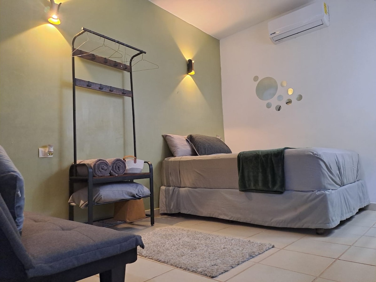 Ciesz się tym funkcjonalnym, cichym i centralnie położonym mieszkaniem. Posiada 1 sypialnię z 1 łóżkiem typu queen i rozkładaną sofą, idealną dla 3 osób, wyposażoną kuchnię, taras, pełną łazienkę, duży garaż na 2 pojazdy. Położony zaledwie 15 minut od lotniska, 5 minut od centrum miasta i esplanady, 9 minut od Plaza Altabrisa, Muzeum CICOM i ważnych alei, łatwy wjazd i wyjazd z miasta, sklepy spożywcze, Oxxo i tereny zielone zaledwie jedną przecznicę dalej, szybkie WiFi do pracy i relaksu