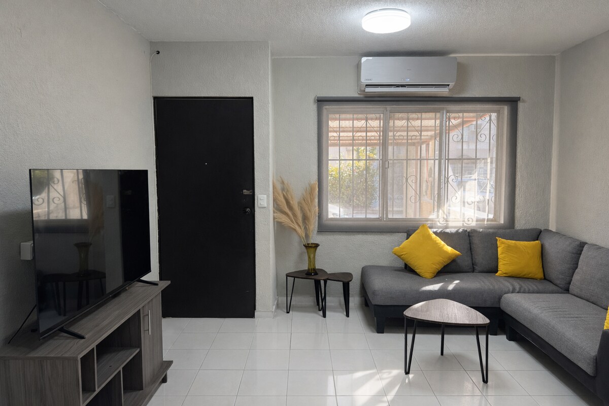 Nowy i wygodny apartament 13 minut od lotniska. I 10 minut od centrum Villahermosa, 10 minut od Galerias Tabasco 2000. Znajduje się minutę drogi od restauracji serwującej owoce morza nad falochronem Villahermosa. W odległości 3 minut spacerem znajduje się supermarket, w którym można zrobić zakupy. Mieszkanie jest kompletne. Posiada: -Internet - Pełna kuchnia -Over -2 sofy – Klimatyzowany salon i sypialnia -2 duże łóżka typu queen size - Smart TV z Netflix Dwie łazienki